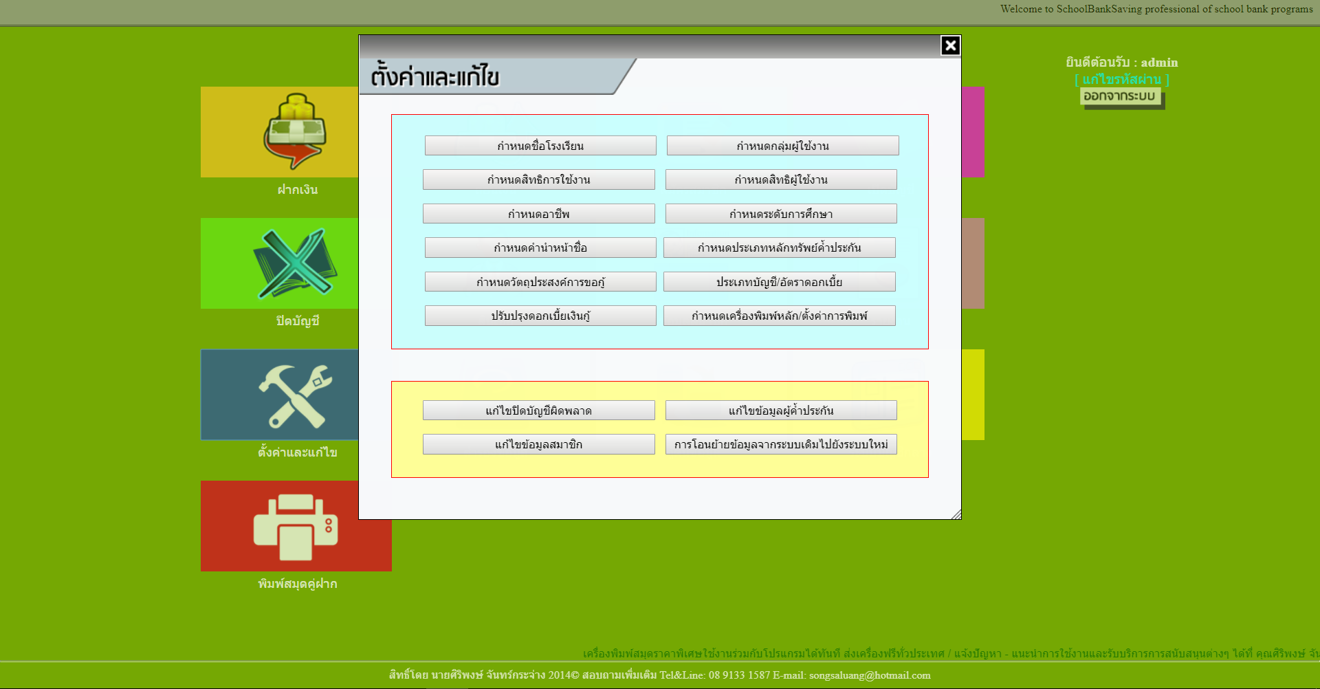 ระบบธนาคารในโรงเรียน เงินฝากออมทรัพย์สำหรับนักเรียน สำหรับโปรแกรมที่มีชื่อว่า โปรแกรม SchoolBankSaving เป็นโปรแกรมสำหรับการบริหารจัดการ ธนาคารในโรงเรียน เพื่อกิจกรรมการฝากเงินของโรงเรียน ให้กับนักเรียน ครู หรือ พนักงานต่างๆ มีการฝากเงิน ถอนเงิน การคิดดอกเบี้ย งานสินเชื่อและรายงานสรุปต่างๆ เหมาะสำหรับโรงเรียนที่มีกิจกรรม ให้นักเรียนฝากเงิน เพื่อส่งเสริมให้นักเรียน นักศึกษา รู้จักการประหยัด และ รู้จักการออม พร้อมทั้งยังมีฟังก์ชั่นที่รองรับการใช้งานกับเครื่องพิมพ์ ในการพิมพ์สมุดคู่ฝาก สลิปฝาก – ถอน ได้